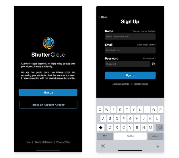 The first step when you run the Shutter Clique app is to create an account. To do this, click on the Sign Up button on the welcome screen. This will take you to the Sign Up screen, shown above right.