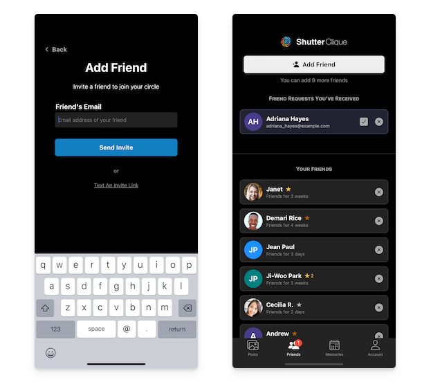 To add a new friend, you can click on the "Add Friend" button at the top of the Friends screen (see above right). To connect with a friend on Shutter Clique you need to know one of two things about them:
