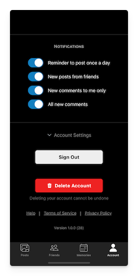 If you decide that you want to delete your account, you can do this from the Account screen. At the bottom of that screen you can click on the "Account Settings" section to reveal its contents, including the "Delete Account" button.
