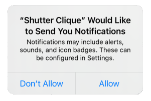 If you denied the iOS notification permission popup, you will not receive any notifications. If you want to change this, you can go to the Shutter Clique settings from the iOS settings app under Settings > Shutter Clique.