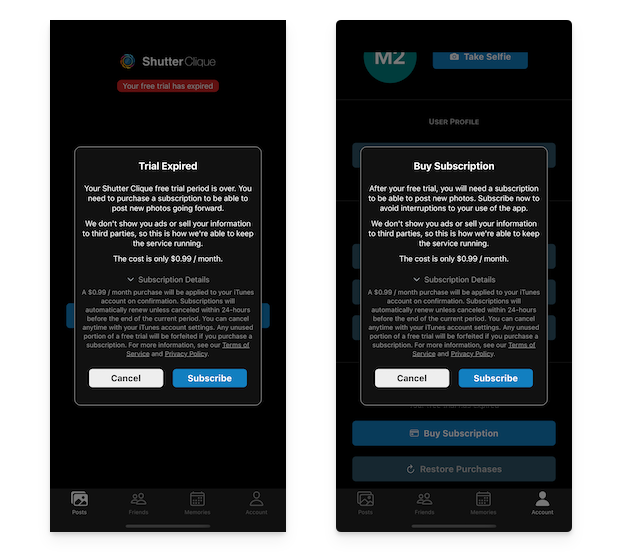 Take Photo: When you press the "Take Photo" button after the free trial period has expired, you will be presented with a dialog asking you to subscribe.