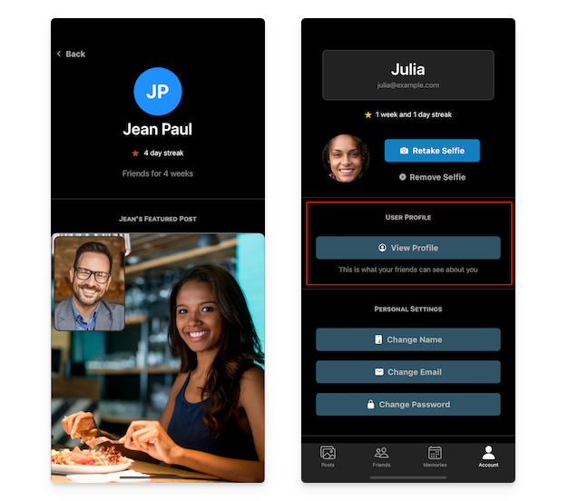 You can access a friend's user profile by tapping on their name on the Friends screen, or by selecting "View Profile" from the ⋯ menu on the top-right of their post on the Posts screen.
